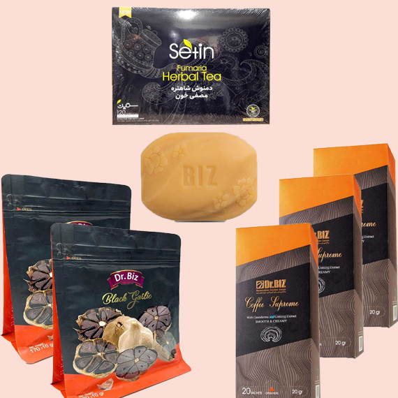۳ عدد قهوه سوپریم دکتر بیز ۲ عدد سیر سیاه دکتر بیز ۱ عدد دمنوش مصفی خون دکتر بیز ۱ عدد صابون گانودرما دکتر بیز: .