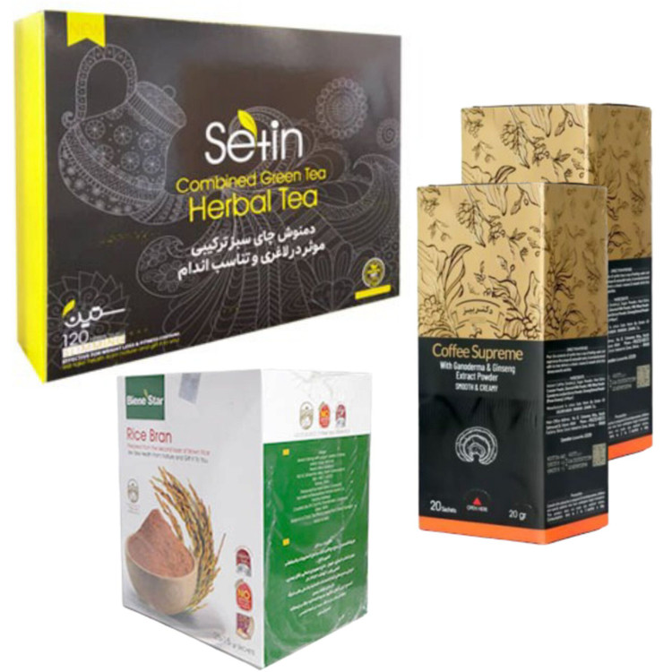 2 عدد قهوه سوپریم باعصاره قارچ گانودرما 1 عدد سبوس برنج از لایه دوم برنج قهوه ای 1 عدد دمنوش چای سبز برای تناسب اندام ( دمنوش لاغری ): .