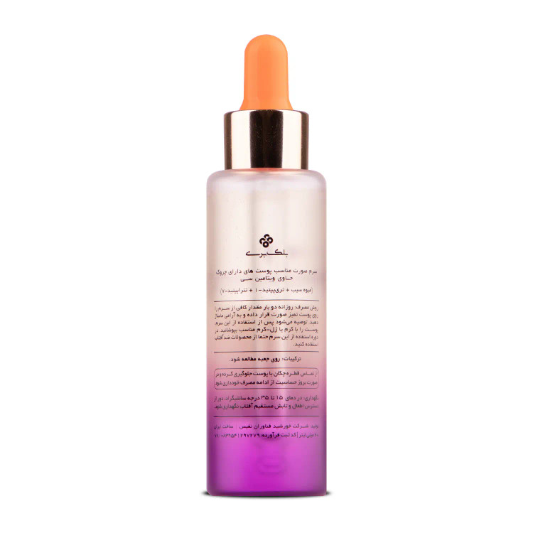 شماره پروانه بهداشتی ساخت:56/22449 سرم حاوی ویتامین سی بلکبری، یک محصول قدرتمند در رفع چروک پوستی و کمک به جوانسازی پوست میباشد. ترکیبات استفاده شده در این سرم، ضمن بازسازی سلولهای پوستی باعث تحریک تولید کلاژن شده و به روشن شدن پوست کمک میکنند.
