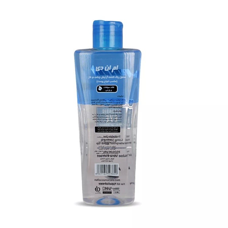 پاک کنندهی آرایش چشم دو فاز MND ، با خاصیت آبرسانی قوی، محافظت کننده و التیام بخش پوست دور چشم است که بدون احساس چربی بر روی پوست، هر نوع آرایش غلیظ، ضد آب و هر گونه آلودگی را به آسانی پاک میکند. این محصول با بهره گیری از مرطوب کنندهها و مواد موثری همچون عصارهی آلوئهورا ، رطوبت لایهی محافظ پوست را حفظ میکند و مانع از ایجاد احساس خشکی و کشیدگی در سطح پوست میشود در نتیجه از ایجاد چروک زیر چشم جلوگیری میکند. از طرفي اين پاككننده فاقد الكل در تركيبات خود است كه با تسكين سوزش پوست در فصلهای سرد سال، رطوبت را به قسمتهای پاك شده از آرايش میرساند. پاک کننده آرایش چشم دو فاز MND برای انواع مختلف پوست مناسب بوده و با فرمولی سبك، پوست حساس اطراف چشم شما را بدون نياز به آبكشی تميز و مرطوب نگه میدارد.