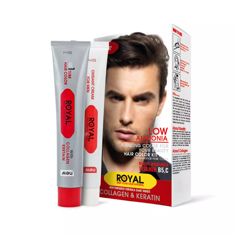 شماره پروانه : 56/14822 کیت رنگ موی مردانه رویال با بکارگیری از پیشرفته ترین فرمولاسیون روز دنیا و روش مصرفی هوشمندانه در طراحی این کیت، علاوه بر استفاده بسیار آسان، بهترین عملکرد و رنگ پذیری را برای موهای شما به ارمغان میآورد. کیت های رنگ موی مردانه رویال در 5 رنگ، در طیف های قهوهای و مشکی مناسب برای انواع سلیقههای تولید و عرضه شده است. در کیت رنگ موی مردانه دو تیوپ 50 میلی لیتر وجود دارد که تیوپ سفید، اکسیدان کِرمی و تیوپ خاکستری، رنگ موی آن میباشد.
