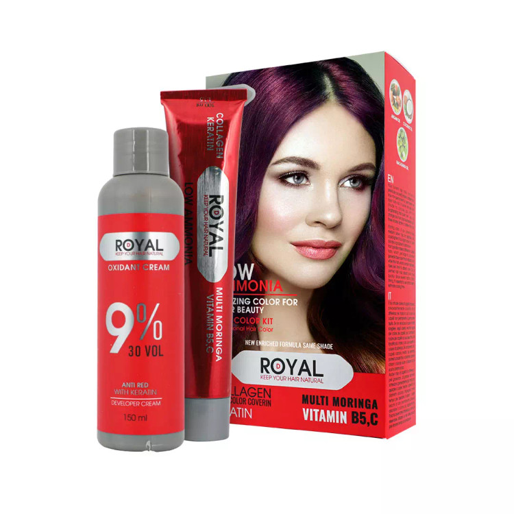 کیت رنگ مو شرابی خیلی روشن رویال کد 7.20 شامل رنگ مو تیوپی 100 میلی لیتر ، اکسیدان 150 میلی لیتر 9 درصد، کلاه، دستکش و فرچه رنگ مو میباشد که با فرمولاسیونی بینظیر و با کیفیتی رقابتی در مقابل برندهای روز دنیا در سبد کالایی نفیس در اختیار شما عزیزان قرار گرفته است، این محصول با پوشش و رنگدهی بالا مناسب با هر نوع سلیقه ای در 30 رنگ متنوع در مجموعه نفیس تهیه و تولید شده است. وجود کراتین و کلاژن در فرمولاسیون این محصول باعث بالا رفتن مقاومت مو میشود، همچنین به دلیل دارا بودن مواد نرم کننده در آن پس از استفاده و شستشو موهای خشک و شکننده نمیشوند. * نکته مهم درخصوص استفاده از این محصول جهت رنگ پذیری بهتر* توجه داشته باشید که در این رنگ مو میبایست پایه رنگ موهای شما پیش از استفاده، 9 یا 10 باشد . همچنین همانطور که در روش مصرف به آن اشاره شده است مواد رنگ مو باید 25 دقیقه به طور کامل روی نواحی مورد نظر قرار گیرد.