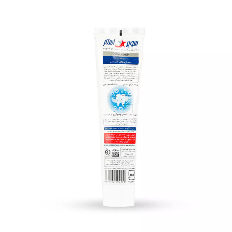 شماره پروانه بهداشتی ساخت: 56/21113- دندانهای حساس، به دلیل آسیب به لایه محافظتی دندان بوجود میآیند. در این حالت فرد با شک حرارتی، دچار دندان درد میشود. خمیردندان مناسب دندانهای حساس سوپراستار، با ترکیبات موثره باعث رفع حساسیت دندان شده و از دندان و لثه محافظت میکند.