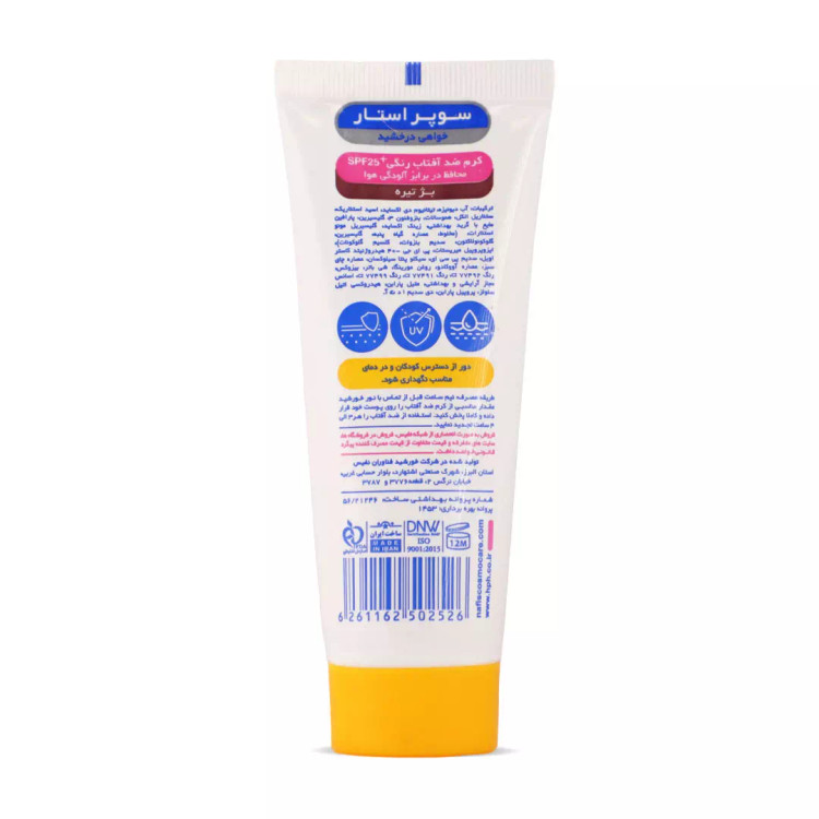 شماره پروانه بهداشتی ساخت: 56/21246- ضدآفتابهای رنگی سوپراستار، با خاصیت ضدآلودگی هوا ضمن محافظت کامل از پوستتان در مقابل اشعههای مضر نور خورشید و همچنین آلایندههای محیطی، بخاطر داشتن خاصیت کرمپودری، میتواند یک پوشش قوی بر روی پوست شما ایجاد کند. وجود حجم بالای آنتیاکسیدان در این محصول باعث میگردد که عوارض ایجاد شده از نور خورشید و آلودگیهای محیطی رفع گردد.