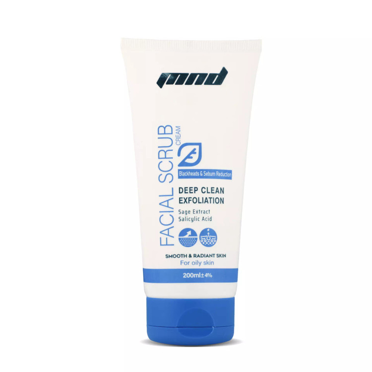 شماره پروانه بهداشتی ساخت: 56/26668 کرم اسکراب صورت مناسب پوستهای چرب ام ان دی با خاصیت کاهش دهنده چربی و جوشهای سر سیاه به پوست شما کمک میکند تا با حذف چربی اضافی از سطح پوست مانع از جذب آلودگی و ایجاد انواع جوش میشود.