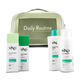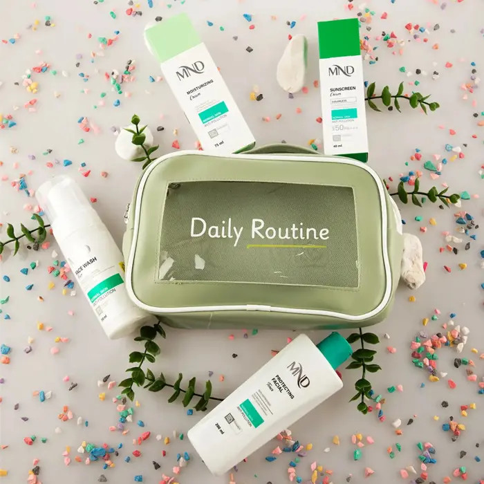 این پک مراقبت روزانه MND مناسب پوستهای معمولی بوده و شامل فوم شستشو، تونر صورت محافظت کننده، کرم مرطوب کننده و کرم ضدآفتاب است.