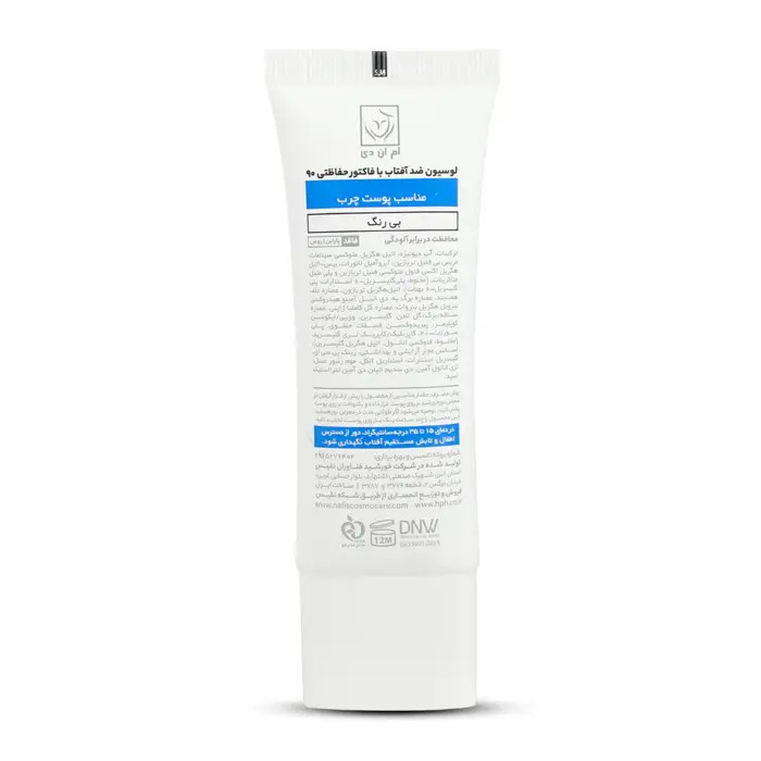 لوسیون ضد آفتاب با فاکتور حفاظتی 90 (SPF 90) بی رنگ ام ان دی مناسب پوست چرب
