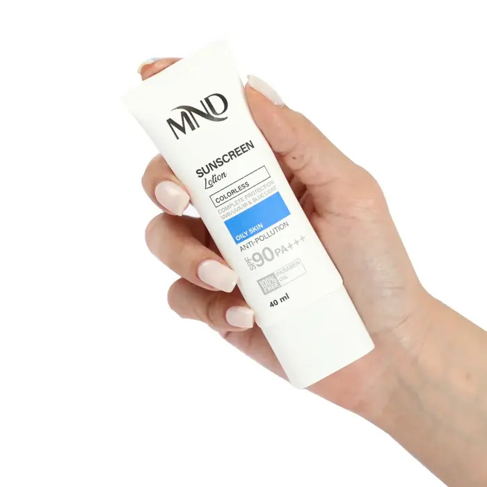 افراد دارای پوست چرب نیز باید از محصولات ضدآفتاب برای محافظت از پوست خود استفاده کنند و لوسیون ضدآفتاب بی رنگ با فاکتور حفاظتی 90 برند MND برای این افراد و بدون روغن تولید شده است. در این لوسیون از فیلترهایی استفاده شده که قادرند از ورود اشعههای UVA و UVB خورشید به پوست جلوگیری کنند. در کنار این ترکیبات، از عصاره ساقه/برگ/گل لادن به منظور جلوگیری از تاثیر مخرب نور آبی ساطع شده از وسایل الکترونیکی پیرامون انسان بر پوست و عصاره علف هفتبند برای ممانعت از آسیب دیدن فیبرهای پروتئینی پوست توسط اشعه مادون قرمز کمک گرفته شده است تا پوست به صورت کامل در برابر انواع طیفهای نوری محافظت شود. این محصول ترکیباتی مانند زینک پیسیای، پیریدوکسین فسفات حلقوی و عصاره برگ به را نیز در خود دارند که با کاهش دادن ترشح سبوم (چربی طبیعی سطح پوست) موجب بهبود شرایط پوست چرب میشوند. همچنین این محصول حاوی عصاره گل کاملیا ژاپنی را نیز میباشد که تولید ترکیبات التهابی توسط ذرات معلق و فلزات سنگین را کاهش میدهد و به همین دلیل این محصول قادر به حفاظت موثر از پوست در برابر آلودگی محیطی است.