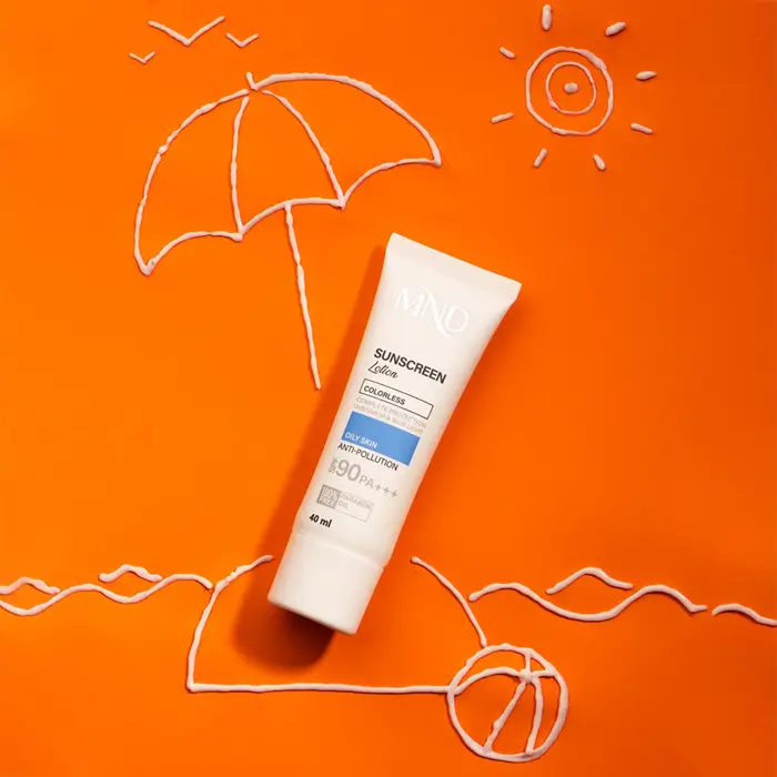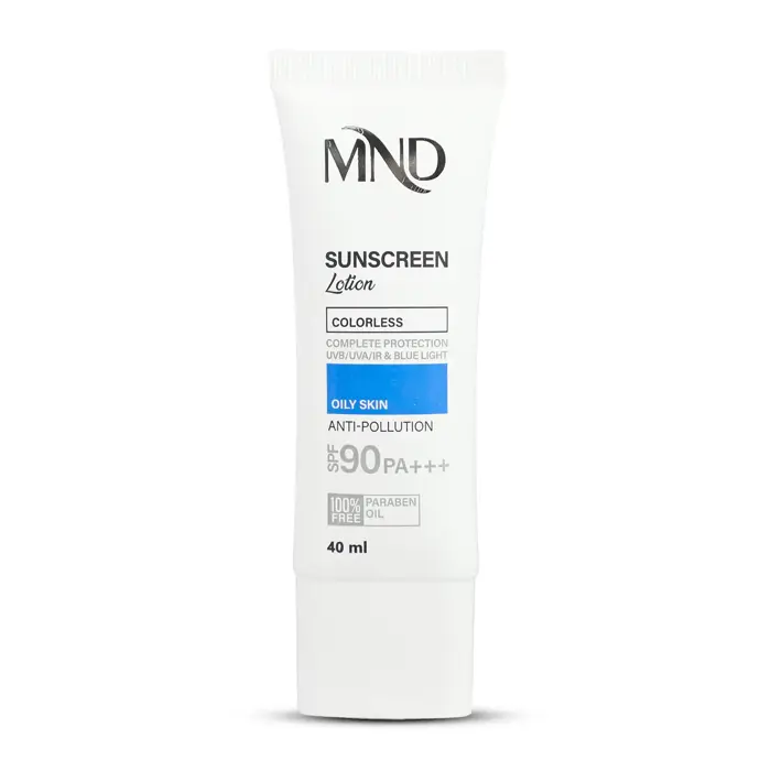افراد دارای پوست چرب نیز باید از محصولات ضدآفتاب برای محافظت از پوست خود استفاده کنند و لوسیون ضدآفتاب بی رنگ با فاکتور حفاظتی 90 برند MND برای این افراد و بدون روغن تولید شده است. در این لوسیون از فیلترهایی استفاده شده که قادرند از ورود اشعههای UVA و UVB خورشید به پوست جلوگیری کنند. در کنار این ترکیبات، از عصاره ساقه/برگ/گل لادن به منظور جلوگیری از تاثیر مخرب نور آبی ساطع شده از وسایل الکترونیکی پیرامون انسان بر پوست و عصاره علف هفتبند برای ممانعت از آسیب دیدن فیبرهای پروتئینی پوست توسط اشعه مادون قرمز کمک گرفته شده است تا پوست به صورت کامل در برابر انواع طیفهای نوری محافظت شود. این محصول ترکیباتی مانند زینک پیسیای، پیریدوکسین فسفات حلقوی و عصاره برگ به را نیز در خود دارند که با کاهش دادن ترشح سبوم (چربی طبیعی سطح پوست) موجب بهبود شرایط پوست چرب میشوند. همچنین این محصول حاوی عصاره گل کاملیا ژاپنی را نیز میباشد که تولید ترکیبات التهابی توسط ذرات معلق و فلزات سنگین را کاهش میدهد و به همین دلیل این محصول قادر به حفاظت موثر از پوست در برابر آلودگی محیطی است.