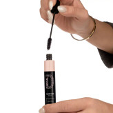 فرچه آغشته به مواد را بر روی مژههای پلک بالا قرار داده و از ریشه تا نوک آنها را با مواد بپوشانید. بهتر است ابتدا از فرچه حجمدهنده (فرچه با رنگ رُزگلد) استفاده کرده و سپس برای بلندکنندگی و حالت دادن به مژهها، از فرچه بلندکننده (فرچه با رنگ مشکی) استفاده کنید. همین روش مصرف را برای پلک پایین نیز انجام دهید. پیشنهاد میشود پیش از ریمل زدن، از فرکننده مژه نیز بهره بگیرید.